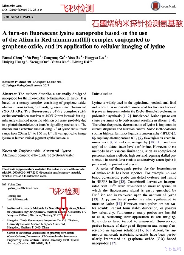 人體需要的常見氨基酸有20種,常常幾個氨基酸共存在各種生命、環(huán)境、食品、醫(yī)療藥品當中。因此一直很難對單一的氨基酸識別檢測。飛秒檢測銳意進取,發(fā)現(xiàn)采用石墨烯-鋁-茜素紅構(gòu)成的納米材料,具有飛秒級別的熒光特征,可以選擇性識別水、溶劑、甚至細胞中的賴氨酸。該項研究成果對未知物檢測、配方分析、配方還原和研發(fā)、工業(yè)診斷、以及疾病診斷有巨大的意義。成果已經(jīng)發(fā)表在國際著名的SCI雜志Microchimica Acta上。得到采用飛秒檢測的國內(nèi)外研究機構(gòu)的大力推薦,目前已經(jīng)有國外機構(gòu)詢問采購該石墨烯納米材料,用于細胞、藥物、水體、植物等方面的配方檢測和未知物分析。也有生產(chǎn)氨基酸的廠家表示將用于賴氨酸生產(chǎn)的在線監(jiān)測,控制產(chǎn)品質(zhì)量。