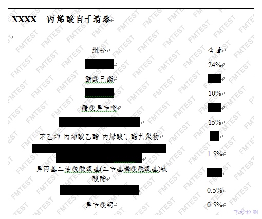 2019年1月中旬,杭州柘大飛秒檢測技術有限公司迎來了江蘇某公司負責人,該客戶因為其產品在市場上沒有太大競爭力度,找到我們飛秒檢測,委托我公司為其提供的丙烯酸自干清漆樣品進行全成分分析,并給出相應含量,幫助其還原出市場有競爭力的產品。