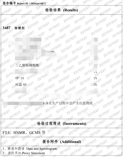 杭州柘大飛秒檢測技術(shù)有限公司,用核磁共振(HNMR)儀器結(jié)合GC-MS以及 “飛秒檢測”技術(shù)分析除銹劑成分,同時利用如下技術(shù)路徑,為客戶提供精準(zhǔn)快速的配方開發(fā)服務(wù)。