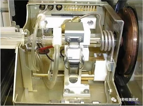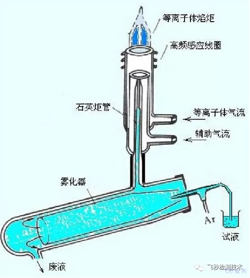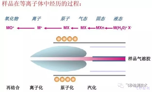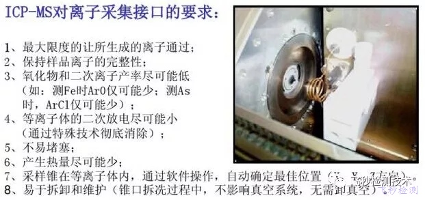從10000K高溫的等離子體中通過接口提取離子進入真空度約為10-6Torr的質譜儀。樣品以液體氣溶膠(在激光燒灼中是固體顆粒)形式被引入,在等離子體被電離,在此區域基體和待測元素的離子被引入質譜儀進行分離,最后由離子檢測系統進行檢測。