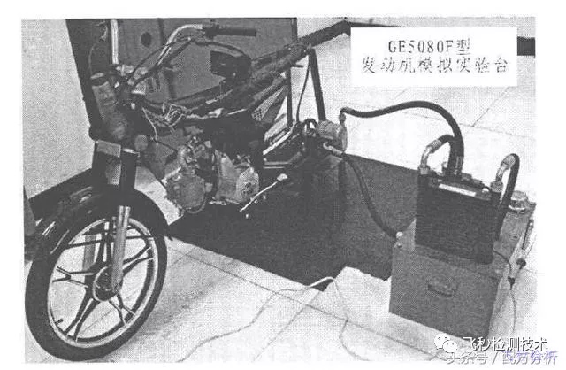 發(fā)動(dòng)機(jī)修復(fù)劑修復(fù)效果需要專業(yè)實(shí)驗(yàn)臺(tái)架。臺(tái)架由四沖程摩托車改裝而成,其發(fā)動(dòng)機(jī)型號(hào)為GE5080F型。模擬實(shí)驗(yàn)臺(tái)架的原理示意圖和實(shí)物圖分別如圖2及圖3所示。模擬臺(tái)架的基本性能參數(shù)參考相關(guān)文獻(xiàn)。該臺(tái)架采用液壓回路加載以實(shí)現(xiàn)對(duì)發(fā)動(dòng)機(jī)的負(fù)載控制。