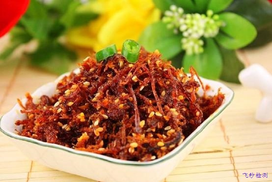 烘烤:托盤上刷一層植物油,以便肉片烤干后脫落,肉片按照紋路橫鋪在托盤上,放入烘房烘烤架最下層,溫度為60-70℃最佳。待烘到水氣消失,肉片由白色變?yōu)楹谏肿優(yōu)樽攸S色時將托盤放到架子上層烘烤,共計3-4小時,晾2-3分鐘后,淋香油后即可。